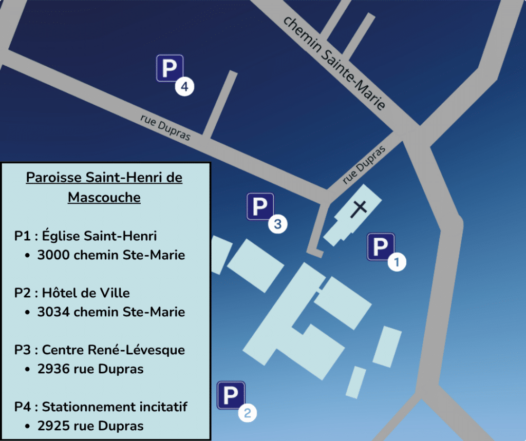 Pour réduire la congestion et faciliter la circulation, nous invitons les usagers à utiliser les stationnements municipaux situés tout près de l’église :